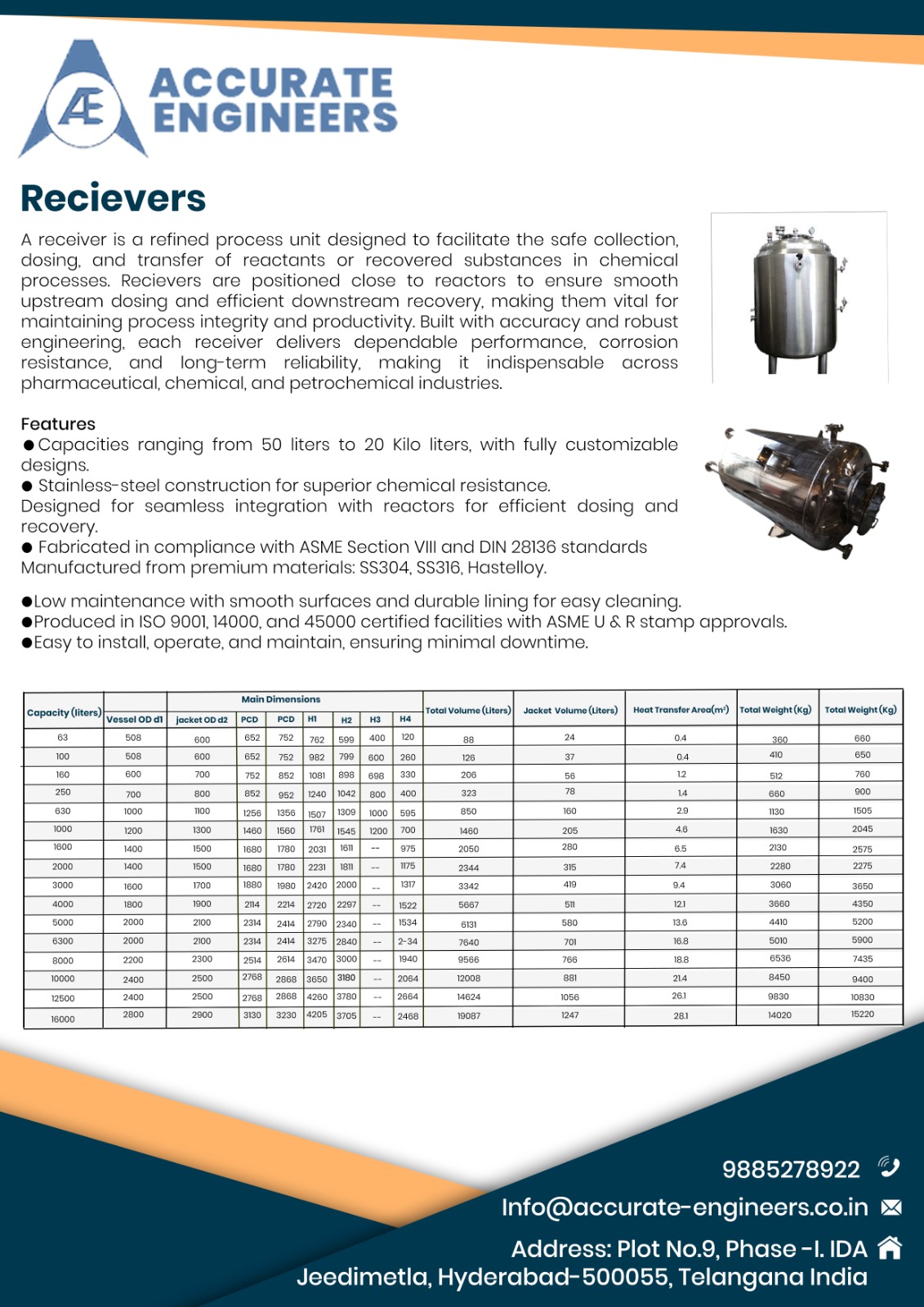 A receiver is a refined process unit designed to facilitate the safe collection, dosing, and transfer of reactants or recovered substances in chemical processes. Recievers are positioned close to reactors to ensure smooth upstream dosing and efficient downstream recovery, making them vital for maintaining process integrity and productivity. Built with accuracy and robust engineering, each receiver delivers dependable performance, corrosion resistance, and long-term reliability, making it indispensable across pharmaceutical, chemical, and petrochemical industries